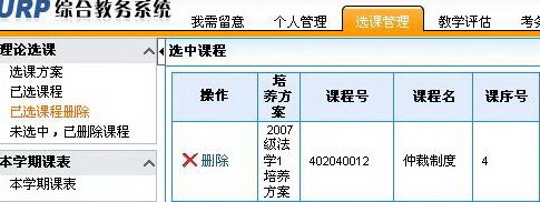 6. 若想删除已经选上的课程,点击左侧边栏“已选课程删除”,点击课程前边的“删除”按钮;