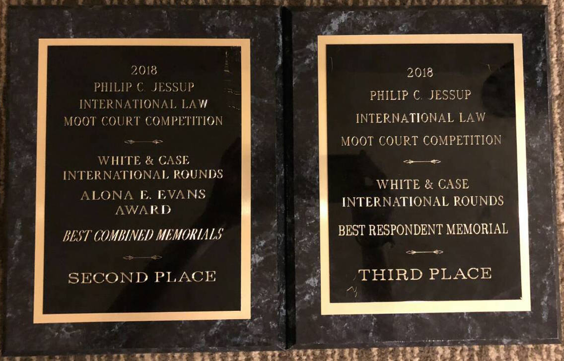 2018年4月1日至7日,第59届“杰赛普国际法模拟法庭大赛”(Philip C. Jessup International Law Moot Court Competition)在美国华盛顿哥伦比亚特区举行。经过激烈角逐,中国政法大学代表队从来自世界90多个国家和地区的121支队伍中脱颖而出,喜获“Alona E. Evans最佳书状奖(综合)亚军”(全球第2名)和“最佳反方书状奖季军”(全球第3名)。据此,中国政法大学代表队成为今年中国大陆唯一一支在杰赛普国际赛中获奖的队伍,也刷新了中国大陆各大院校参赛以来取得的书状最好成绩,此前书状最好成绩是“Alona E. Evans最佳书状奖(综合)季军”(全球第3名),由中国政法大学代表队于2016年国际赛获得。