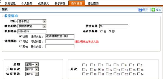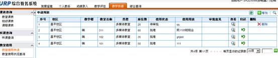 1.点击页面上部“教学资源”及左侧“教室借用申请”得到以下页面。图示用户已经提出了三项申请,已经批准了两项,还有一项待批准。已批准的项目可以归还,没有批准的可以删除。