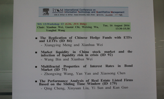第四届信息技术与量化管理国际会议(The FourthInternational Conference on Information Technology and Quantitative Management,ITQM 2016)于2016年8月16日至18日在韩国牙山隆重召开。作为国际信息技术与量化管理学会(IAITQM)主办的每年一次的例会,本次学术会议由韩国Hoseo University承办,会议得到中国科学院虚拟经济与数据科学研究中心、中科院大数据挖掘与知识管理重点实验室、韩国先进科学与技术研究院、韩国贸易工业与能源部、中科院科技政策与管理科学研究所、太极华保等单位的支持和赞助。本次会议的主题是:“推动商务分析与技术的量化管理 (PromotingBusiness Analytics and Quantitative Management of Technology)”。来自韩国、中国、澳大利亚、巴西、智利、哥伦比亚、希腊、伊朗、日本、塞尔维亚、俄罗斯、哈萨克斯坦、罗马尼亚等24个国家和地区的知名学者近150人参会。我校商学院成思危现代金融菁英班的程晴同学参与会议并做了学术报告(会议论文EI收录)。