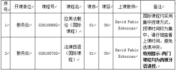 3.课程属性:两门课程均纳入2016级国际课程课组;2015级、2014级、2013级法学专业、法学人才实验班、涉外法学实验班、西班牙语实验班、学术精英班、双培班学生选课可认定为专业选修课,其他专业学生选课认为校任选课。