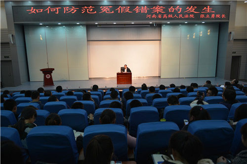 协议签署之后,张立勇在昌平校区刘皇发学术报告厅面向全校学生作了题为《如何防范冤假错案的发生》的主题报告。在报告中,张立勇从法学理论谈到司法实践,并结合河南高院近年来在审判工作中所取得的实践和思考讲述了防范冤假错案的几点意见。整个报告反映出我国法院系统在保护人民生命、财产权利,以人为本方面所取得的进步,为我校法学专业学生上了一堂生动的法律职业素养课。黄进主持了报告和互动环节。